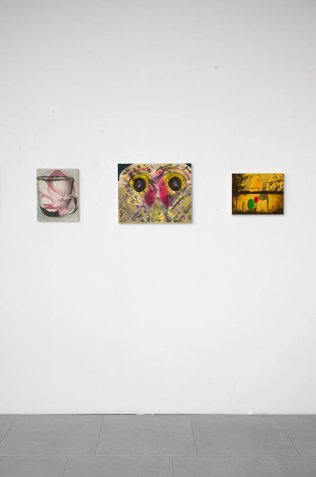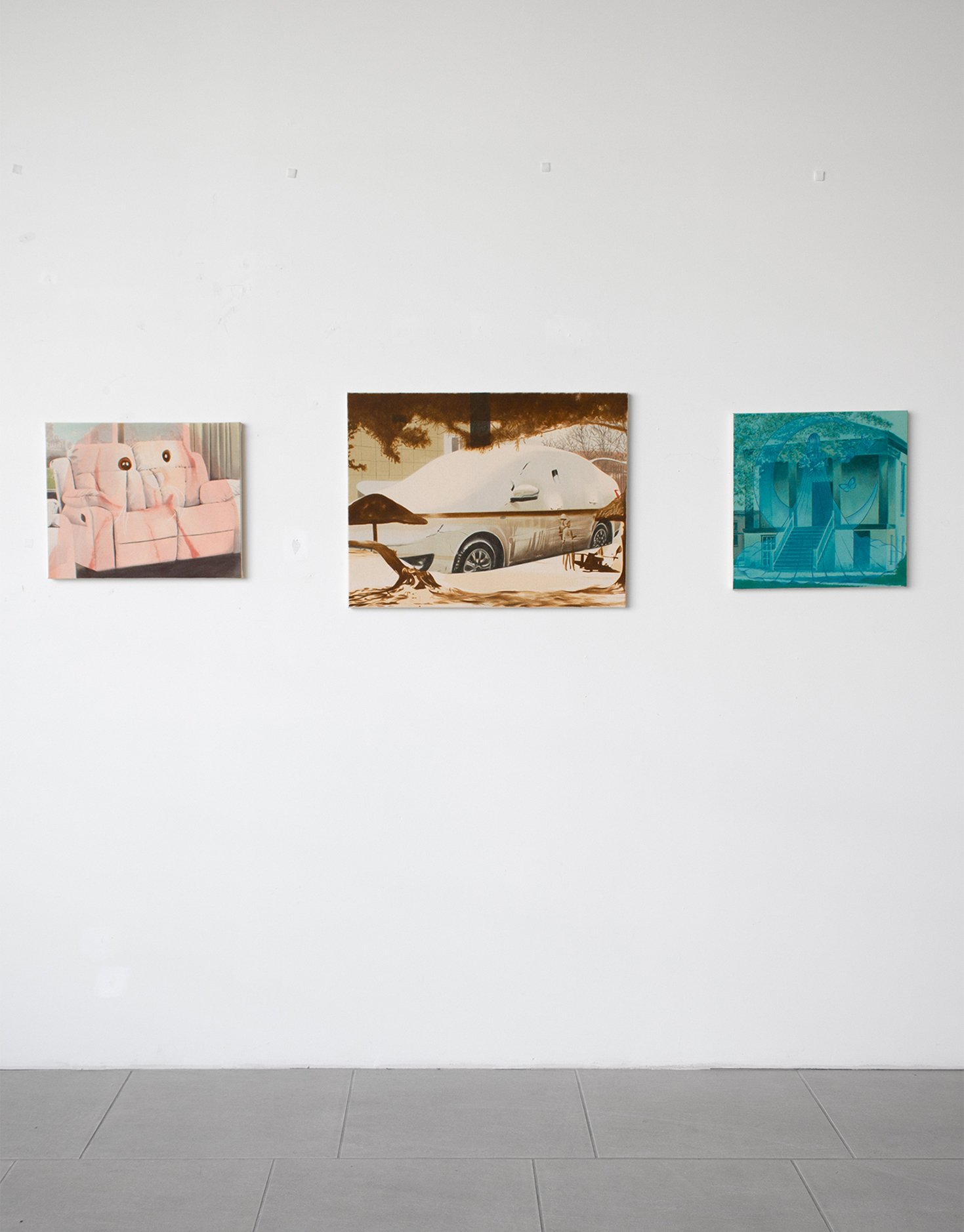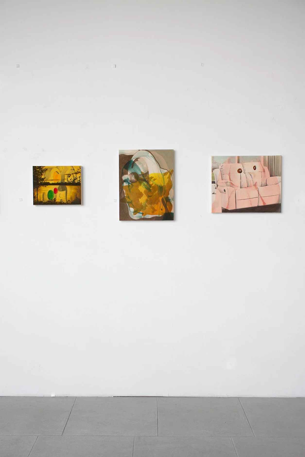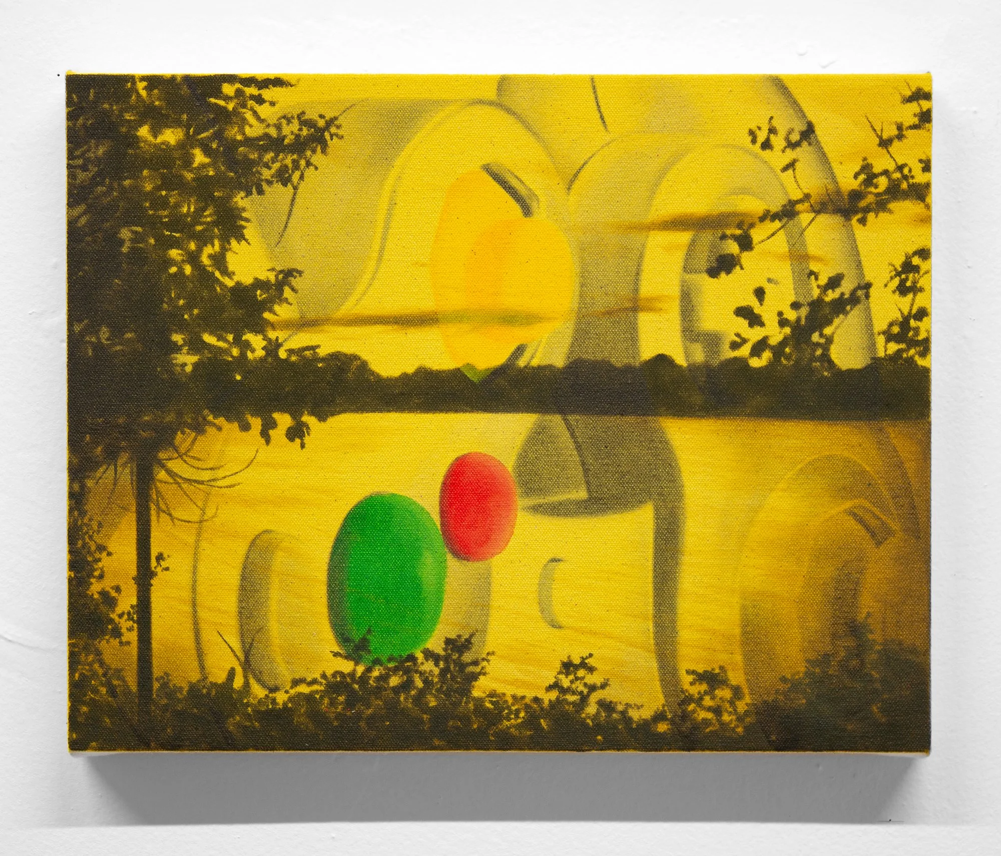 I think of these first and foremost as abstract paintings. Each starts with one image, and is resolved with a second, and sometimes a third. The reaction to the first layer dictates the final composition, so each painting finds its own visual logic intuitively. It’s a process of listening and responding.